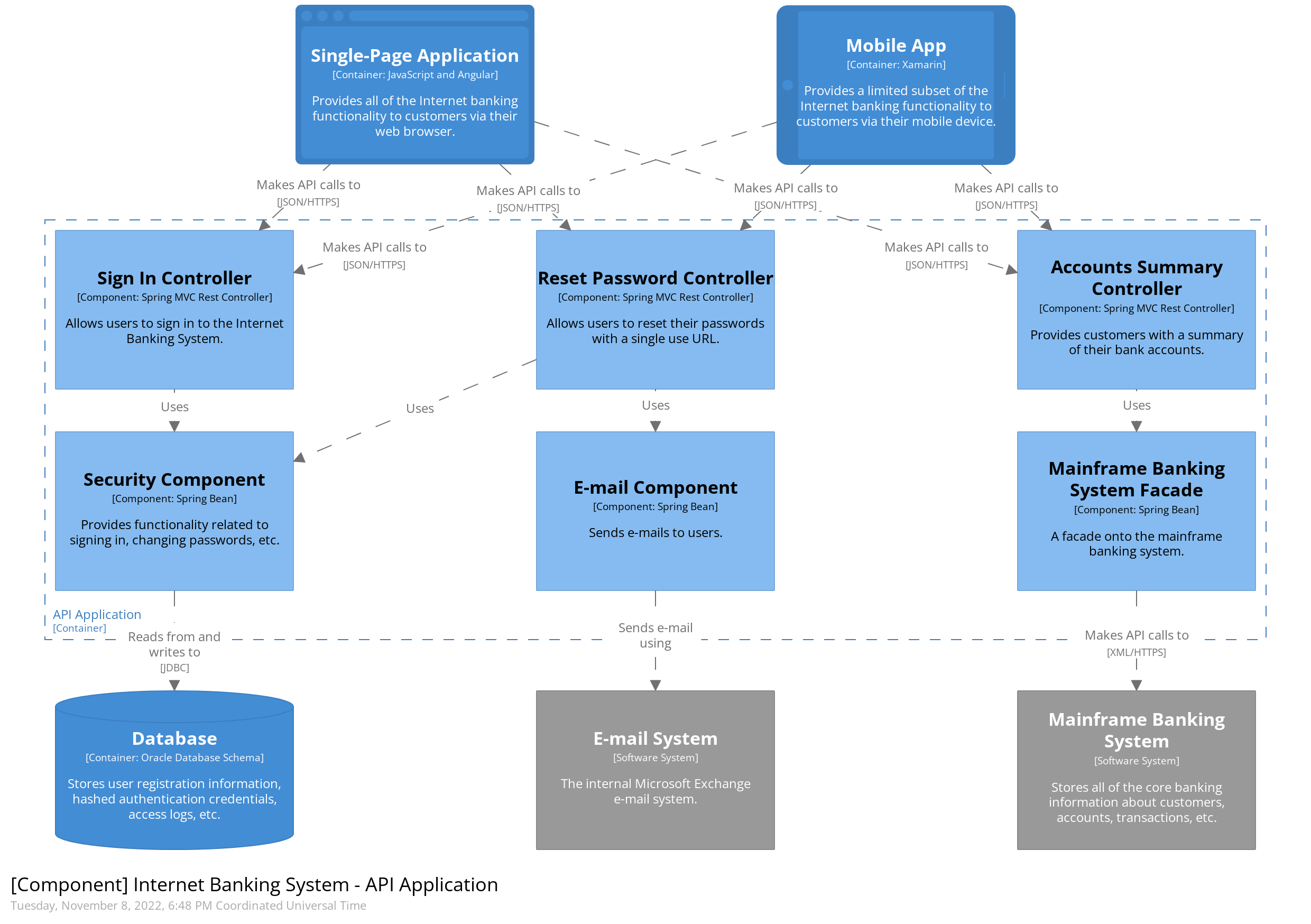 范围:单个软件系统。 主要元素:范围内容器内的组件。 支持元素:容器(在范围内的软件系统内)以及直接连接到组件的人员和软件系统。 目标受众:软件架构师和开发人员。